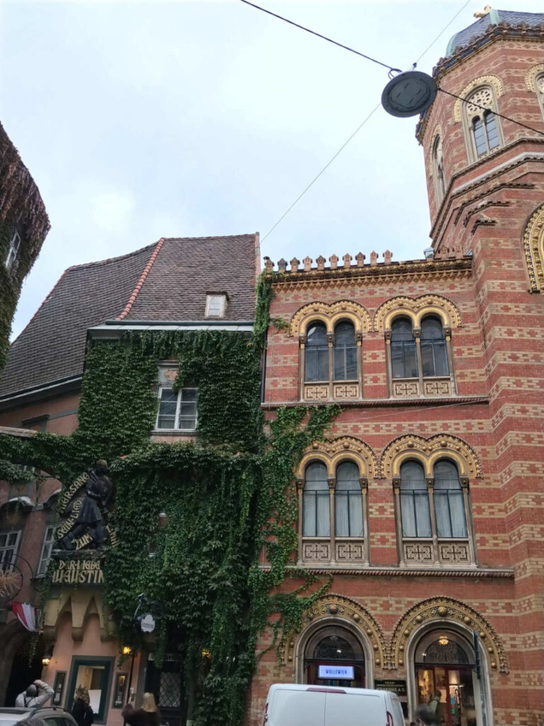 Κρυμμένη σε έναν από τους πολλούς ιστορικούς δρόμους, αυτή η γωνιά αποκαλύπτει τον πλούτο της κεντροευρωπαϊκής αρχιτεκτονικής. Η εικόνα πιθανότατα απεικονίζει μέρος του περίφημου Anker Köz ή κάποια άλλη ιστορική στοά. Το κτίριο στα δεξιά, με την χαρακτηριστική του κοκκινωπή τοιχοποιία και τις πλούσιες χρυσές λεπτομέρειες γύρω από τα παράθυρα, φέρνει στο νου την εκλεπτυσμένη τεχνοτροπία που συναντά κανείς και στη Βιέννη. Αντίθετα, το κτίριο στα αριστερά, καλυμμένο με πυκνό κισσό, προσδίδει μια ρουστίκ, ρομαντική νότα, και ίσως φιλοξενεί κάποιο από τα θρυλικά ruin bars ή παραδοσιακά ουγγρικά εστιατόρια. Αυτή η αντιπαράθεση στυλ είναι η πεμπτουσία της αρχιτεκτονικής ποικιλίας της Βουδαπέστης.